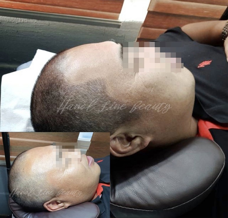 양측두옆으로 모근 채취한 부분과 여러곳의 흉터가 있는 상태였답니다