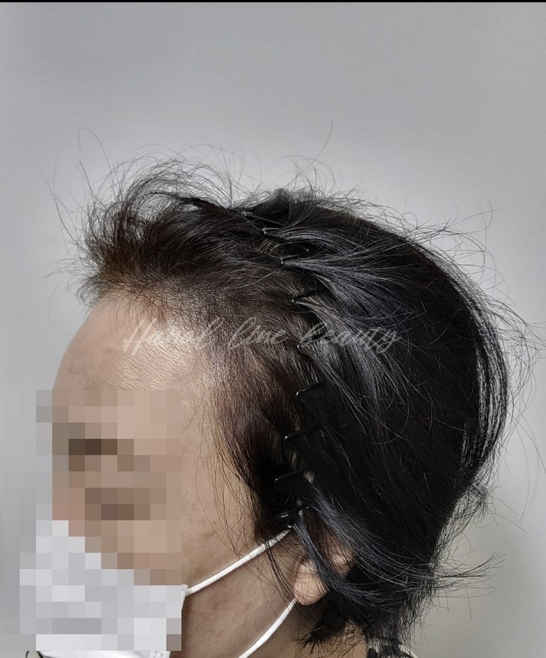 탈모가 진행되어진 부분만 커버할시에는 그로인한 경계선이 보여 시각적으로 이질감이 보이는 현상이 나타난답니다 하여 진행되어진 부분과 연결되어지도록 기존의 모발이 있는 부위와 겹치어 그라데이션으로 작업이 진행되어졌답니다